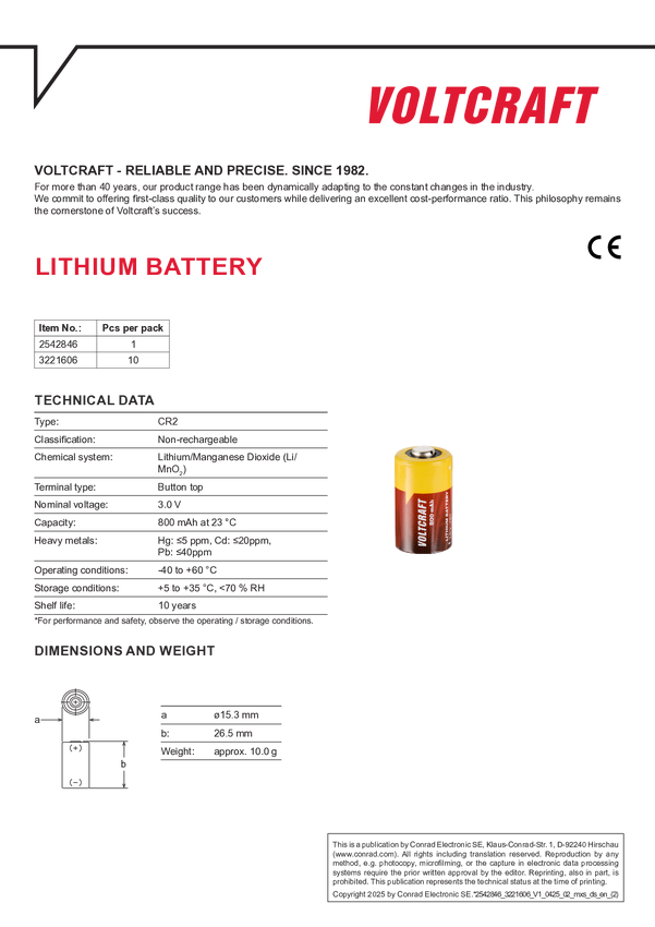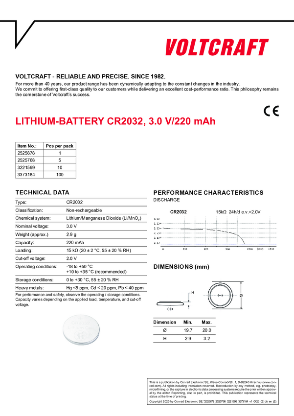 VOLTCRAFT CR 2025 Ogniwo guzikowe 3 V 160 mAh litowe VC-16108000 10 szt.