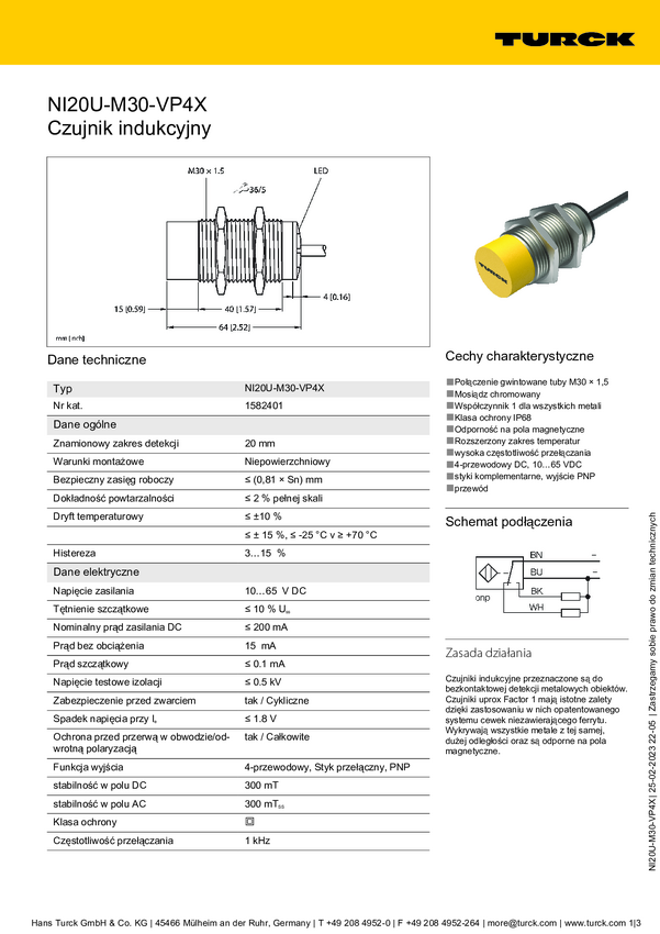 Turck Czujnik indukcyjny nie podtynkowy PNP, Przełącznik NI20U-M30-VP4X