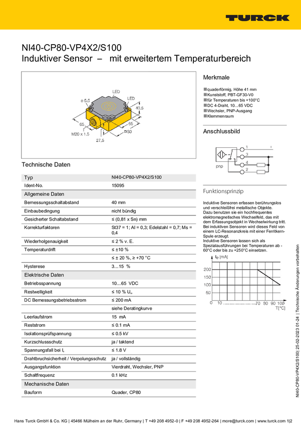 Turck Czujnik indukcyjny nie podtynkowy PNP, Przełącznik NI40-CP80-VP4X2/S100