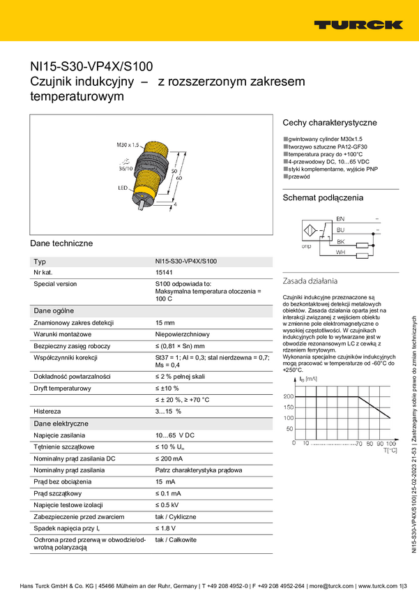 Turck Czujnik indukcyjny nie podtynkowy PNP, Przełącznik NI15-S30-VP4X/S100