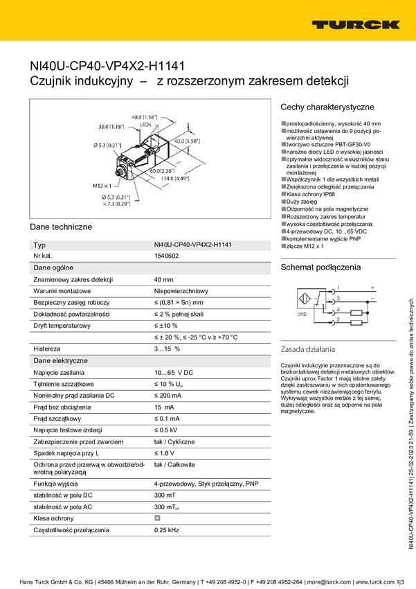 Turck Czujnik indukcyjny nie podtynkowy PNP, Przełącznik NI40U-CP40-VP4X2-H1141