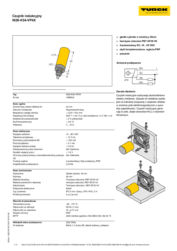 Turck Czujnik indukcyjny nie podtynkowy PNP, Przełącznik NI20-K34-VP4X