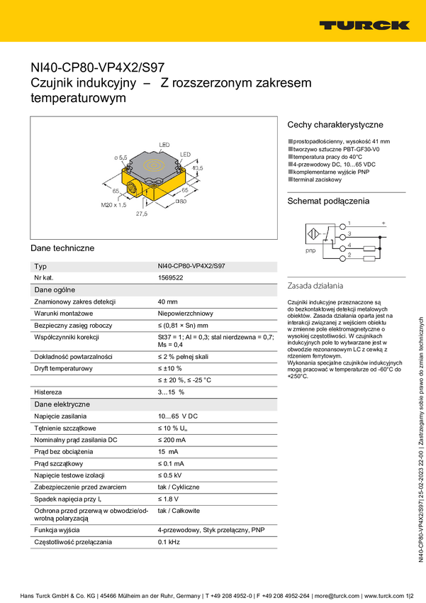 Turck Czujnik indukcyjny nie podtynkowy PNP, Przełącznik NI40-CP80-VP4X2/S97