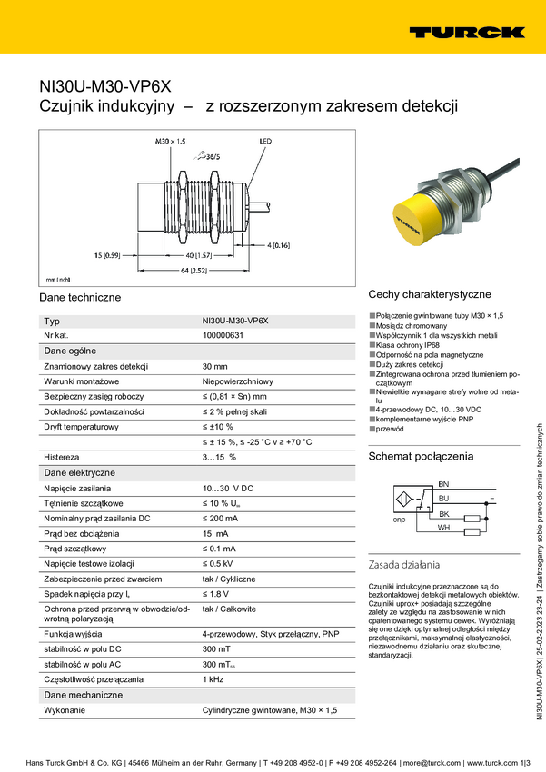 Turck Czujnik indukcyjny nie podtynkowy PNP, Przełącznik NI30U-M30-VP6X
