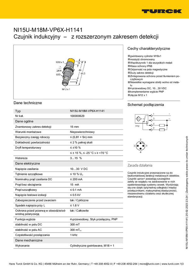 Turck Czujnik indukcyjny nie podtynkowy PNP, Przełącznik NI15U-M18M-VP6X-H1141