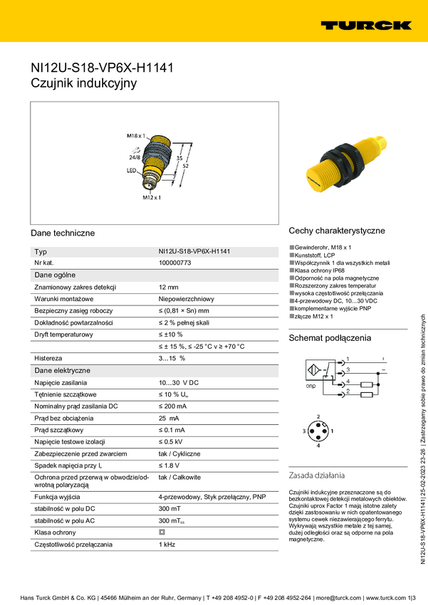 Turck Czujnik indukcyjny nie podtynkowy PNP, Przełącznik NI12U-S18-VP6X-H1141