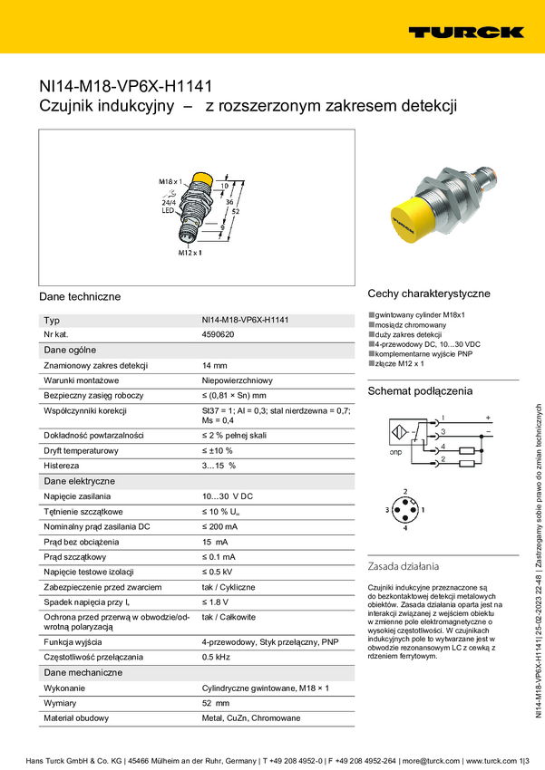 Turck Czujnik indukcyjny nie podtynkowy PNP, Przełącznik NI14-M18-VP6X-H1141