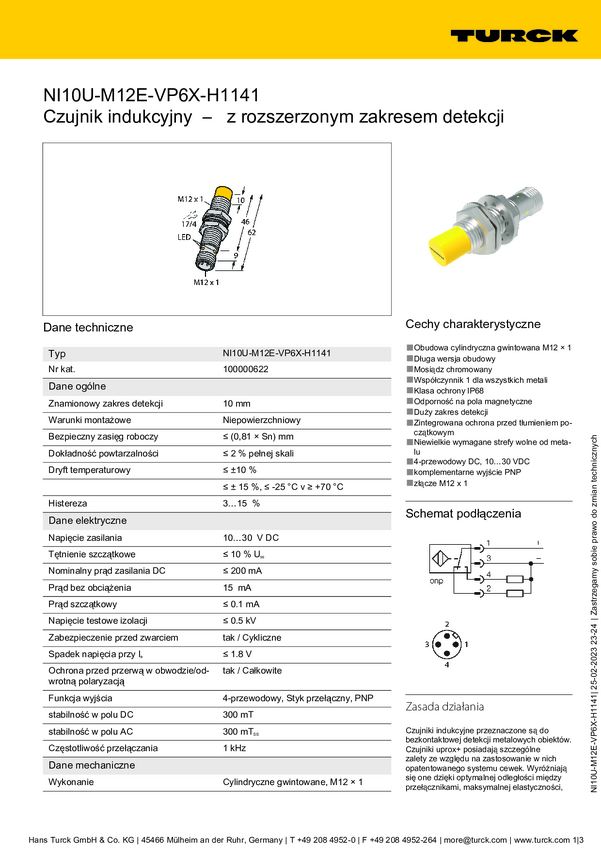 Turck Czujnik indukcyjny nie podtynkowy PNP, Przełącznik NI10U-M12E-VP6X-H1141
