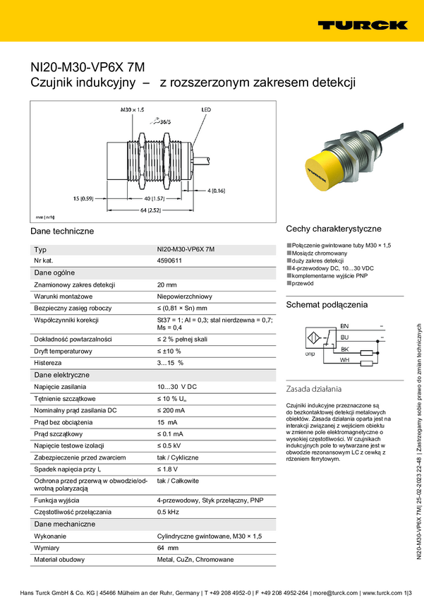 Turck Czujnik indukcyjny nie podtynkowy PNP, Przełącznik NI20-M30-VP6X 7M