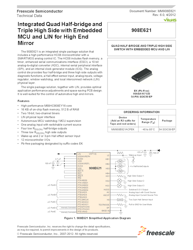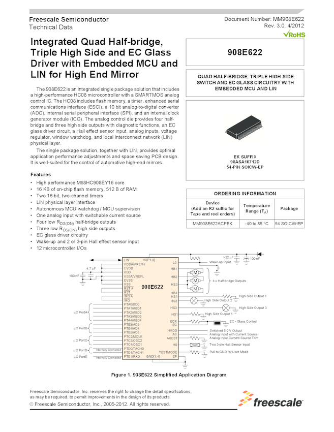 MM908E622: 8-Bit MCU with Vreg, H-B, EC glass Driver, LIN Phy
