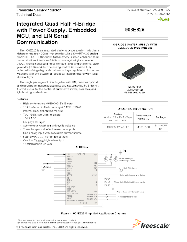 MM908E625: 8-Bit MCU with integrated Vreg, configurable H-B, LIN