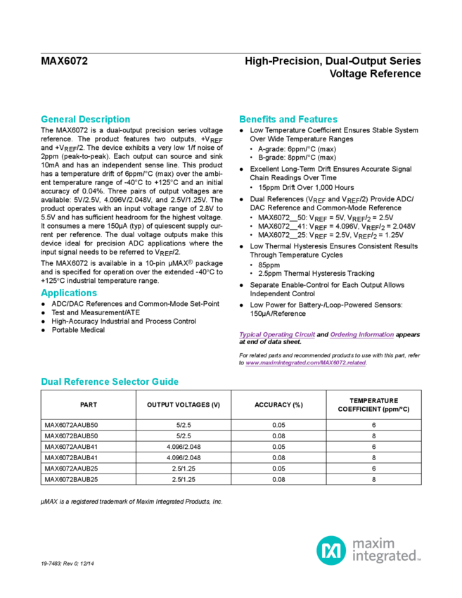 MAX6072B High Precision Dual Vref and Vref/2 Voltage Reference