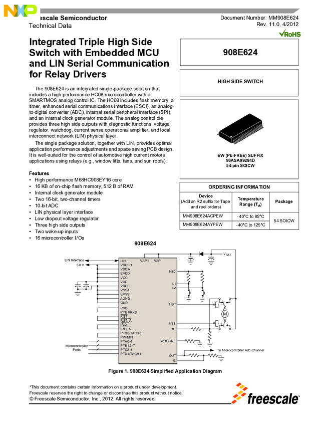MM908E624: 8-Bit MCU with integrated Vreg, HSS, Relay Drivers, LIN