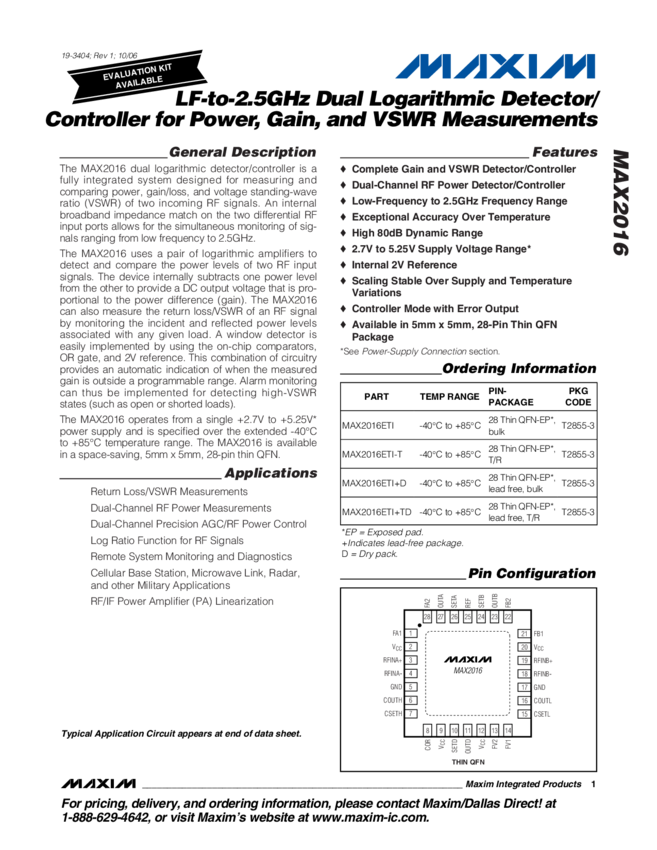 MAX2016 LF to 2.5GHz Dual Logarithmic Detector/Controller for Power, Gain, and VSWR Measurements
