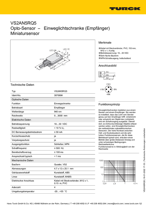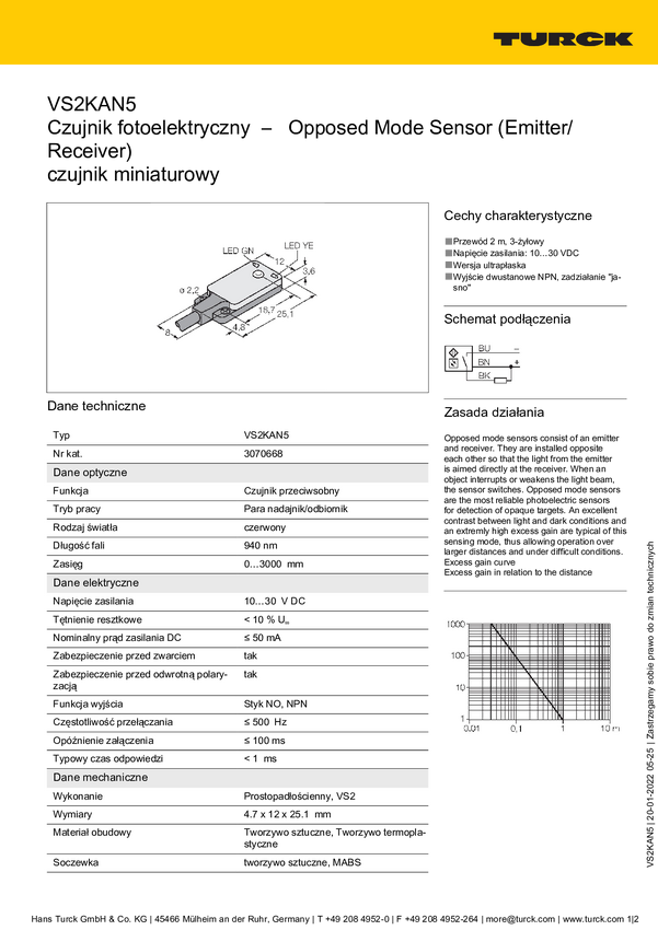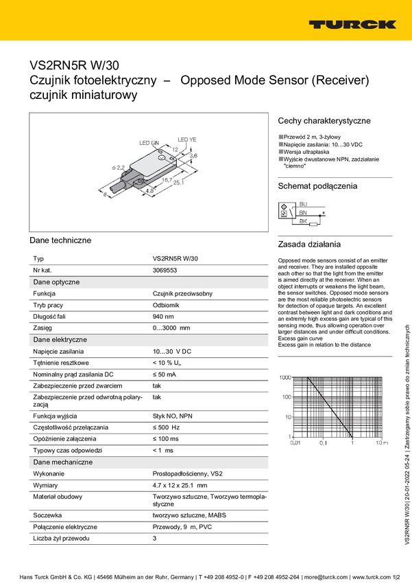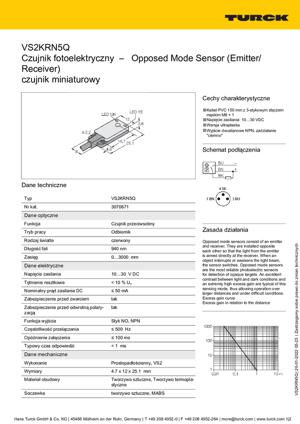 Bezzwrotny czujnik fotoelektryczny Turck VS2KRN5 3070670 1 szt.