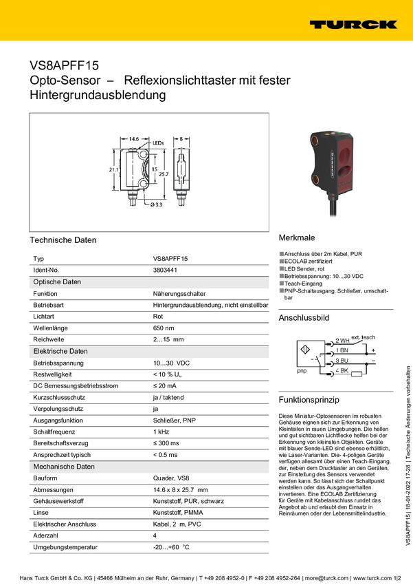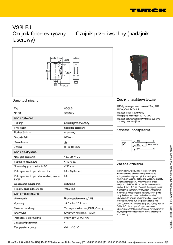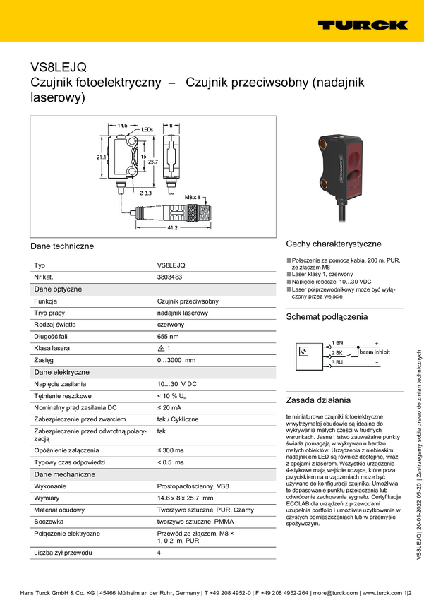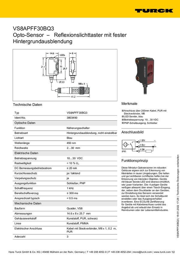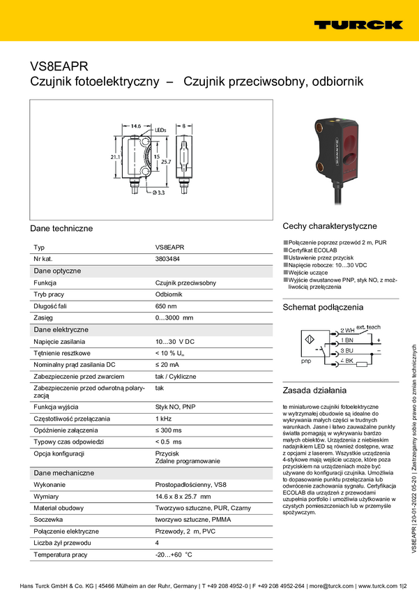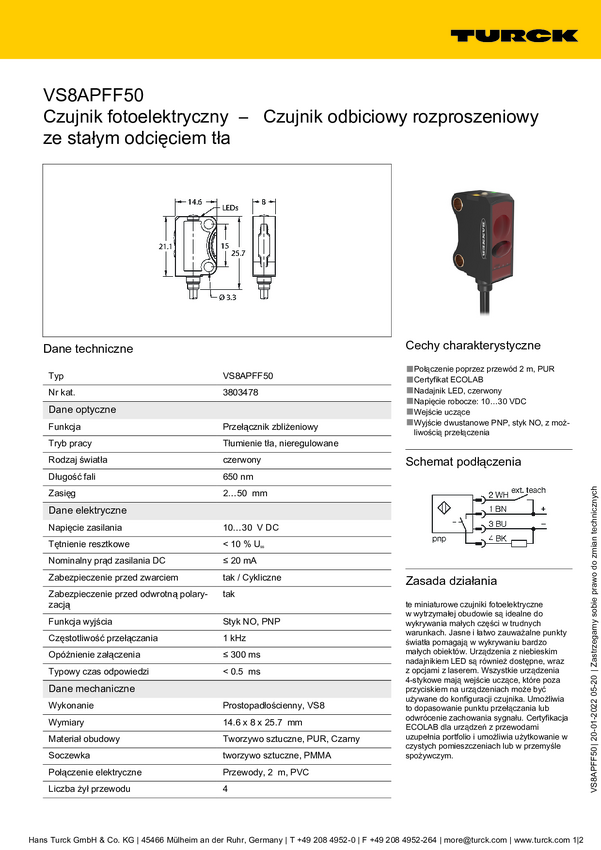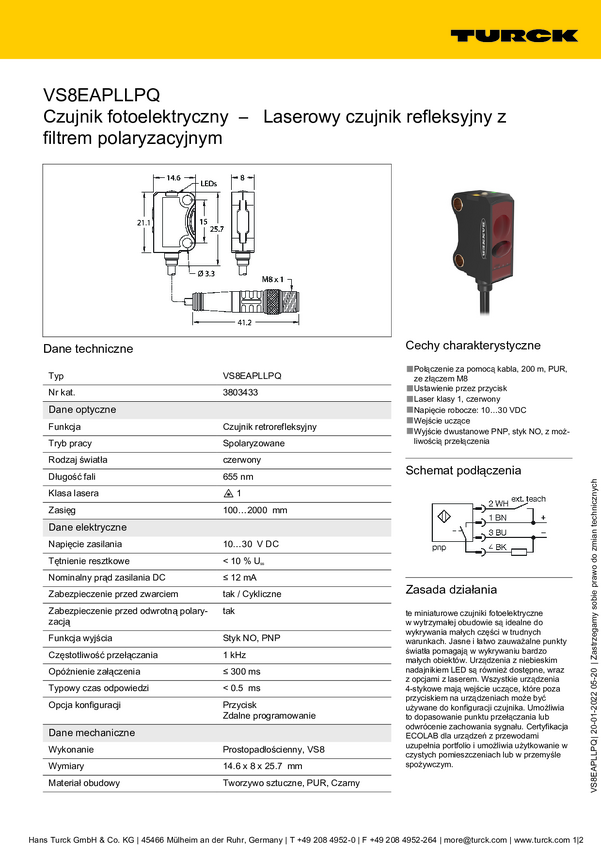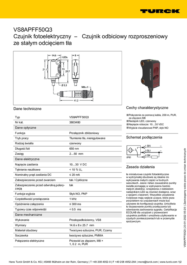 Czujnik dyfuzyjny Turck VS8APFF30 3803453 1 szt.