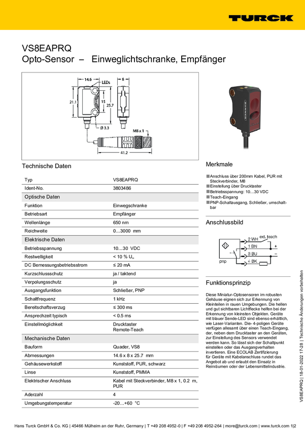 Bezzwrotny czujnik fotoelektryczny Turck VS8EAPRQ 3803486 1 szt.