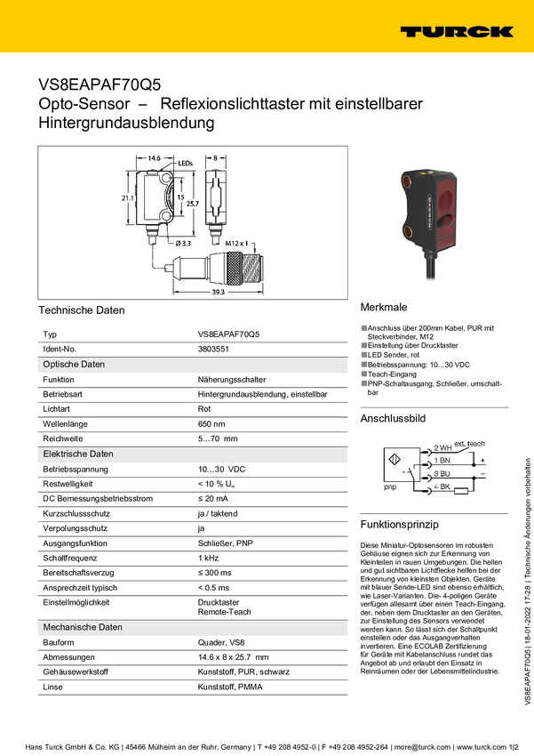 Czujnik dyfuzyjny Turck VS8EAPAF70Q5 3803551 1 szt.