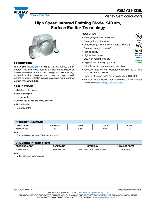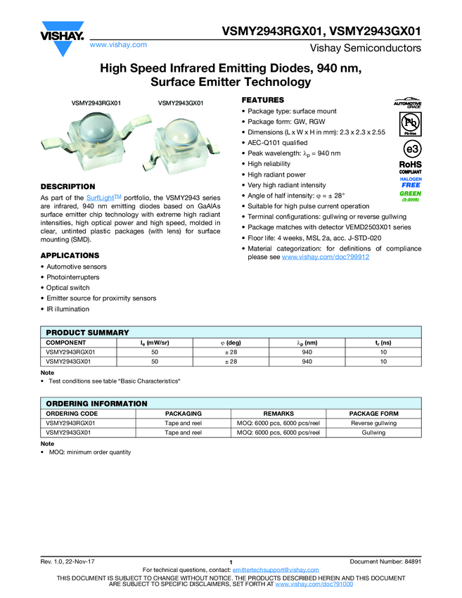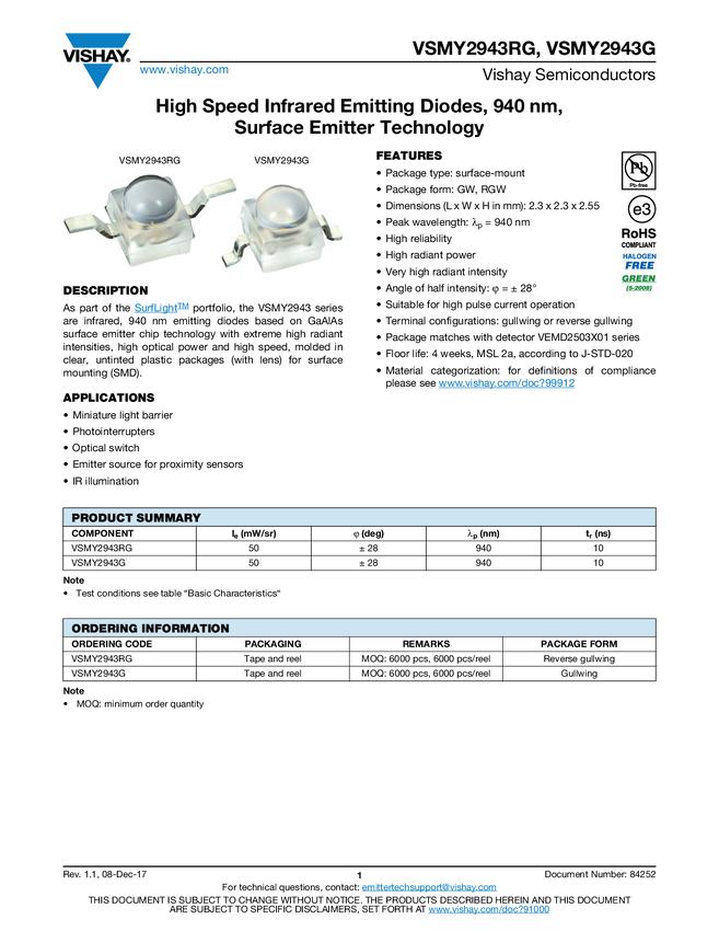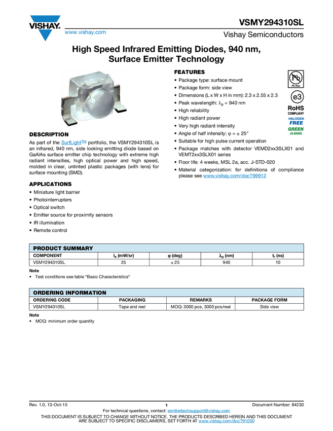 High Speed Infrared Emitting Diodes, 940 nm, Surface Emitter Technology