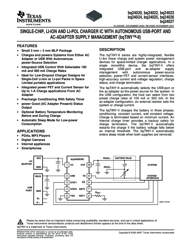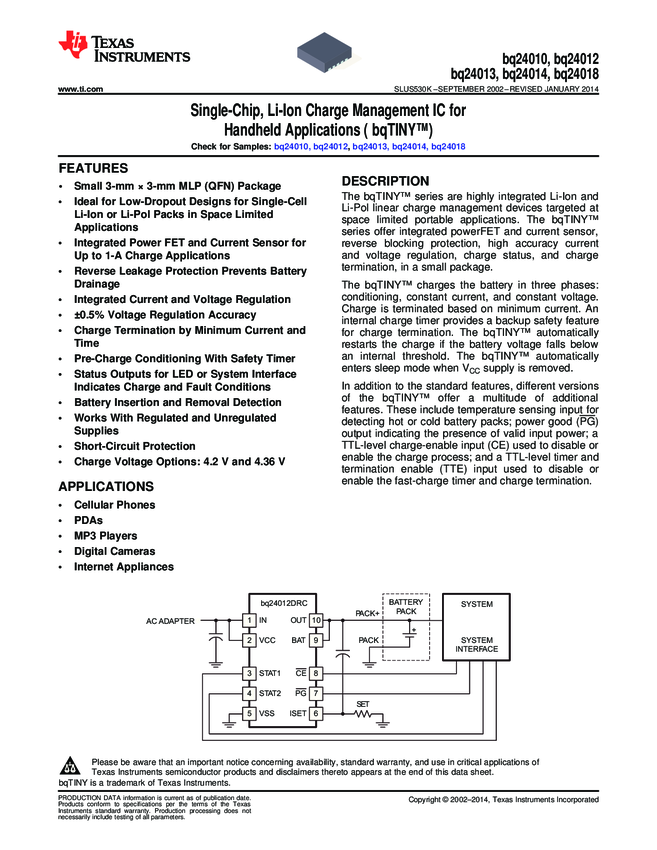 Battery Charger Li-Ion/Li-Pol 1000mA 4.2V 10-Pin VSON EP T/R