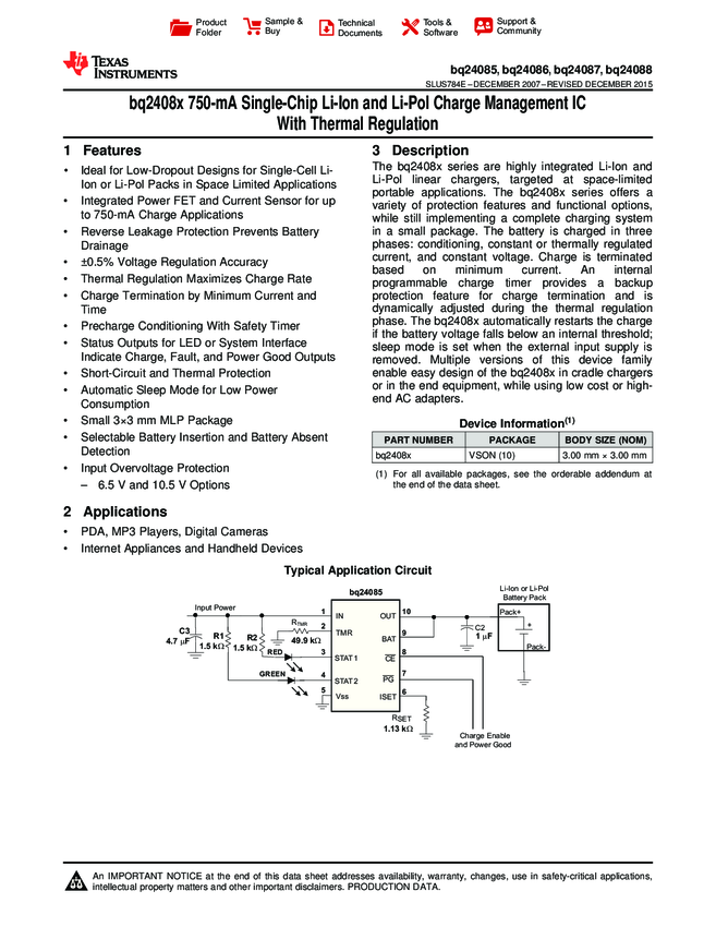 Linear Charge Management Li-Ion/Li-Pol Packs 750mA 4.2V 10-Pin VSON EP T/R