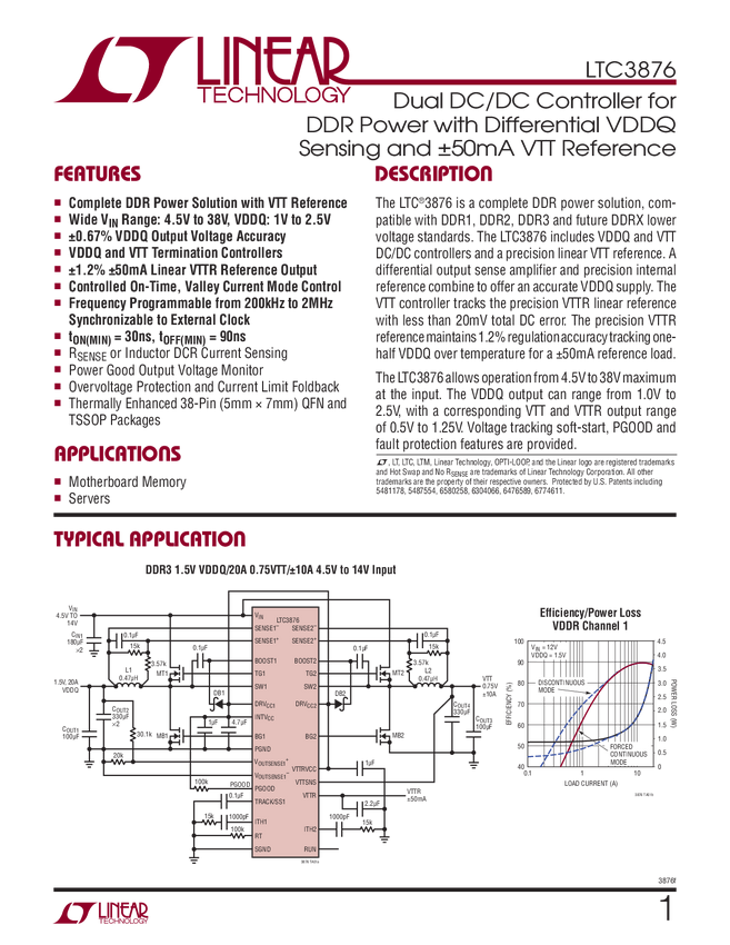 Dual DC/DC Controller for DDR Power with Differential VDDQ Sensing and ±50mA VTT Reference
