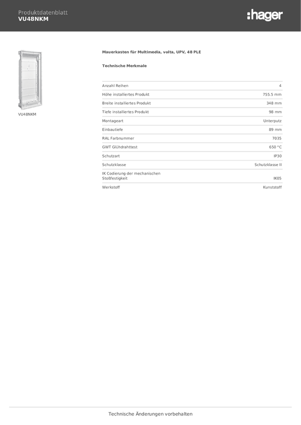 Hager VU48NKM Skrzynka ścienna podtynkowy Ilość rzędów = 4 Content 1 szt.
