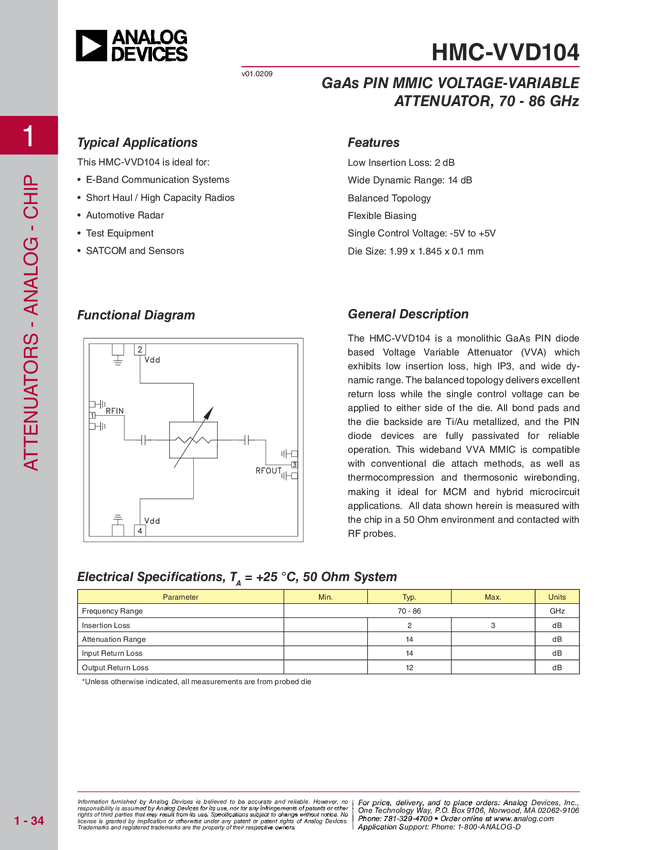 GaAs Pin MMIC Voltage-Variable Attenuator, 70 - 86 GHz