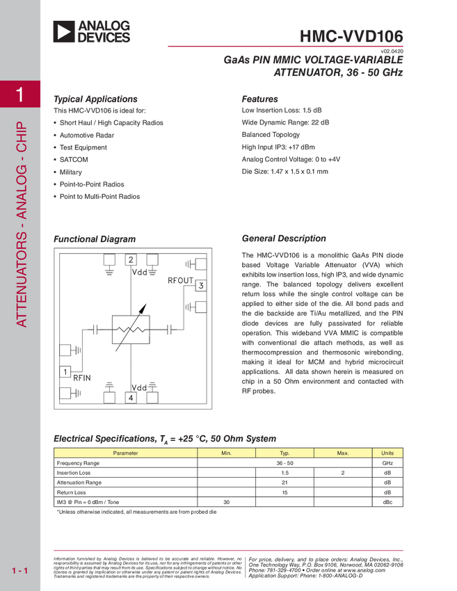 Analog VVA Attenuator Chip, 36 - 50 GHz