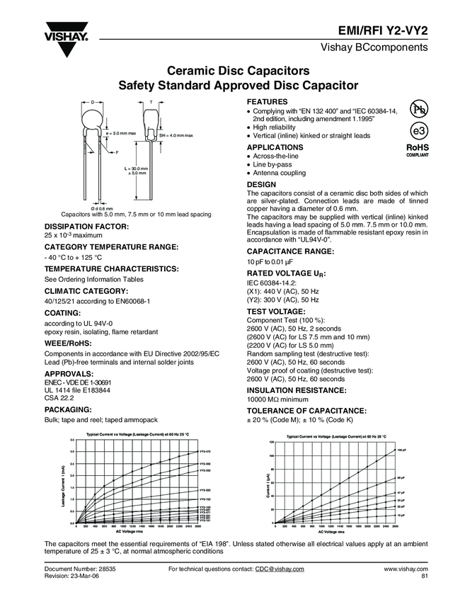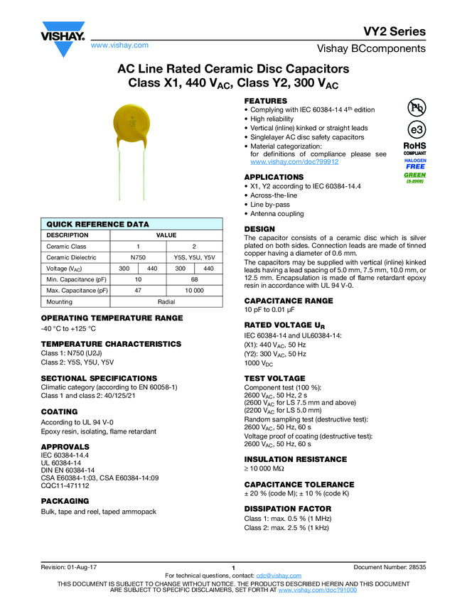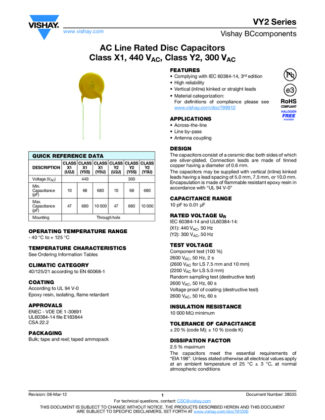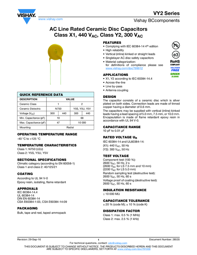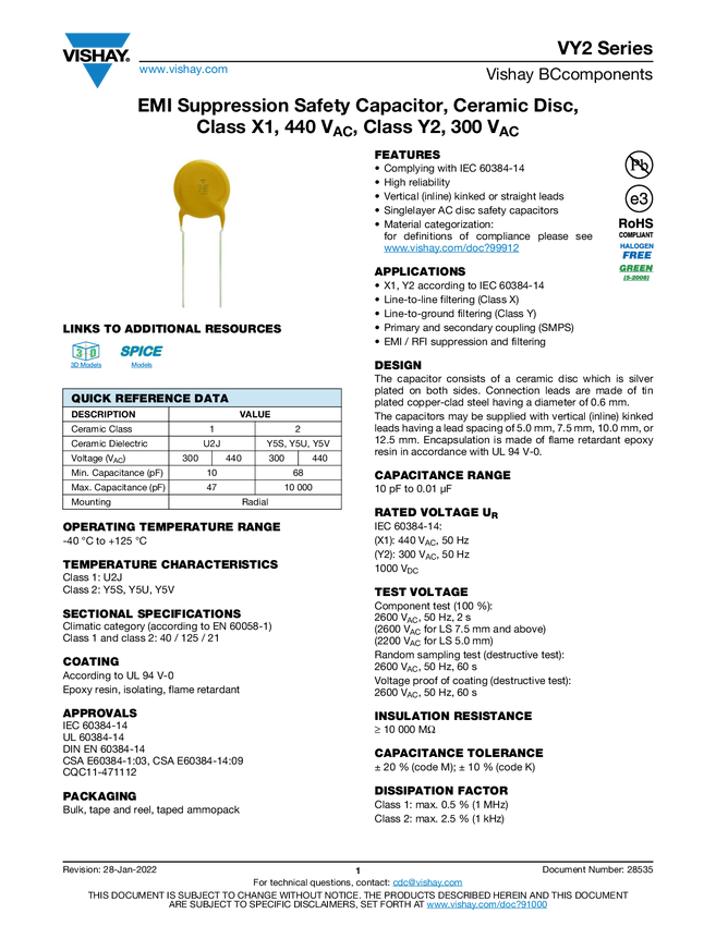 EMI Suppression Safety Capacitor, Ceramic Disc, Class X1, 440 VAC, Class Y2, 300 VAC