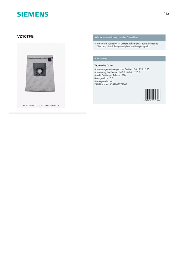 Worki do odkurzacza Siemens Hausgeräte VZ10TFG VZ10TFG
