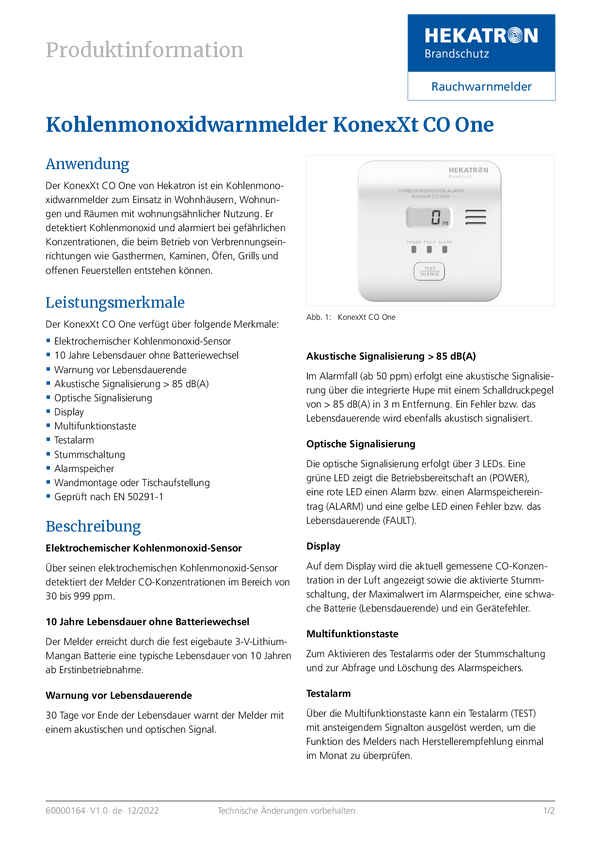 Hekatron KonexXt CO One Czujnik czadu zaw. baterię na 10 lat pracy bateryjne Wykrywanie Tlenek węgla