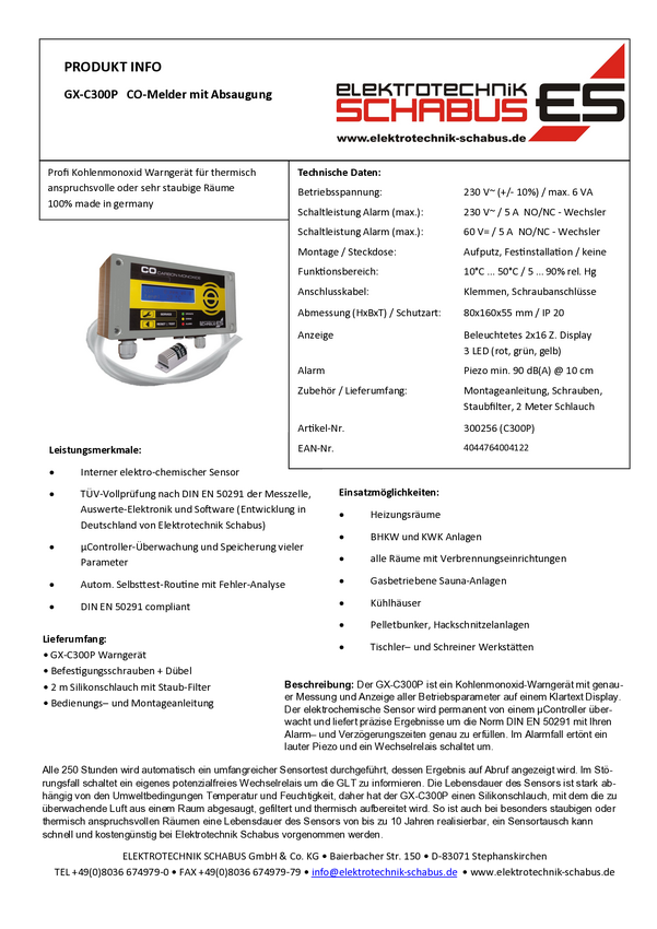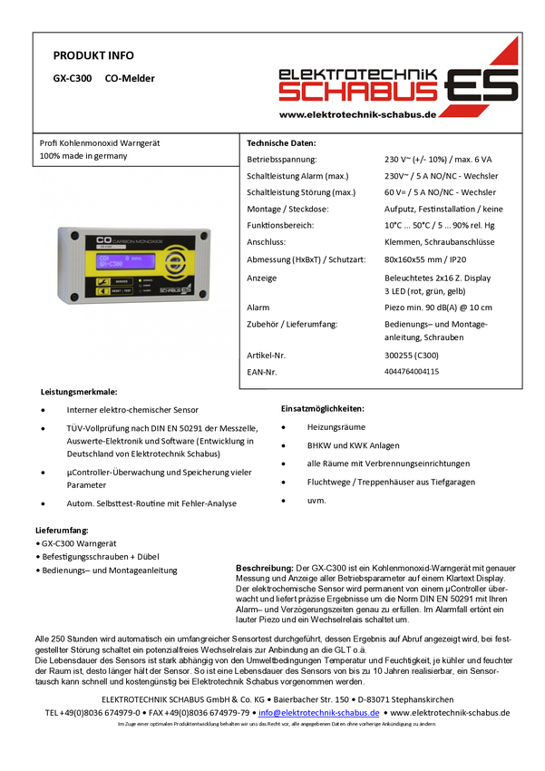 Schabus GX-C300 Czujnik czadu z czujnikiem wewnętrznym z sieci elektrycznej Wykrywanie Tlenek węgla