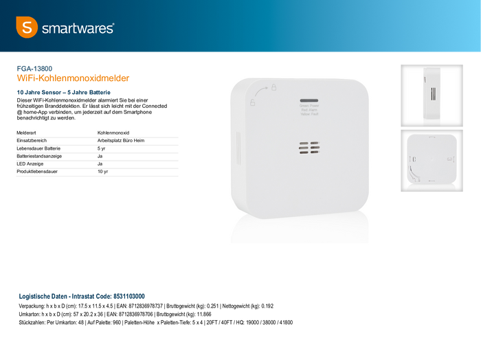 Smartwares FGA-13800 Czujnik czadu z obsługą aplikacji bateryjne Wykrywanie Tlenek węgla
