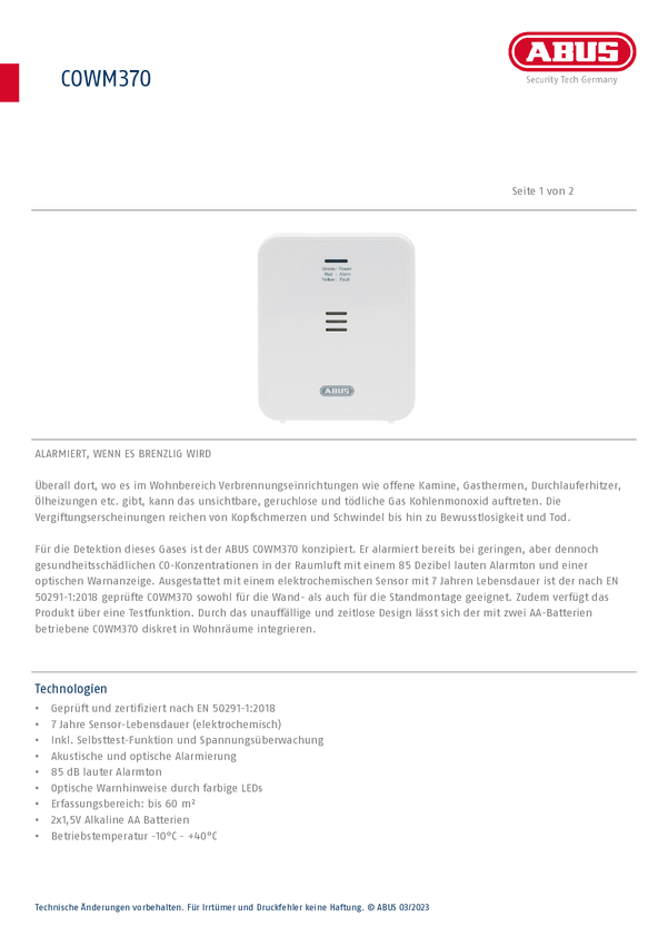 ABUS COWM370 Czujnik czadu bateryjne Wykrywanie Tlenek węgla