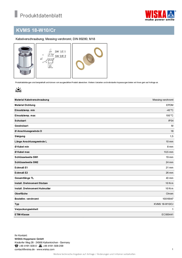 Wiska 10016949 Dławnica kablowa KVMS 24-W10 Cr, od 8 mm, do 10.5 mm, M24, 1 szt.