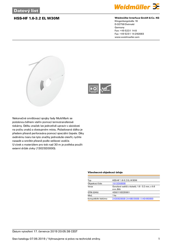 Weidmüller 1513250000 HSS-HF 1.6-3.2 EL W30M System znakowania kabli biały 1 szt.