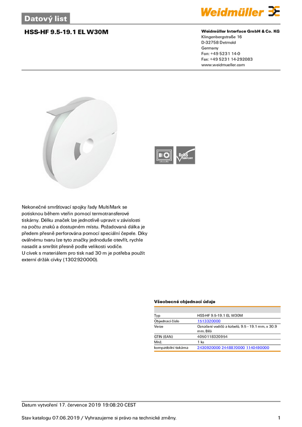 System znakowania kabli Weidmüller HSS-HF 9.5-19.1 EL W30M 1513320000, 1 szt.