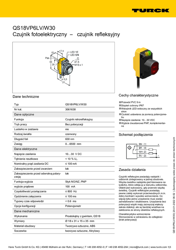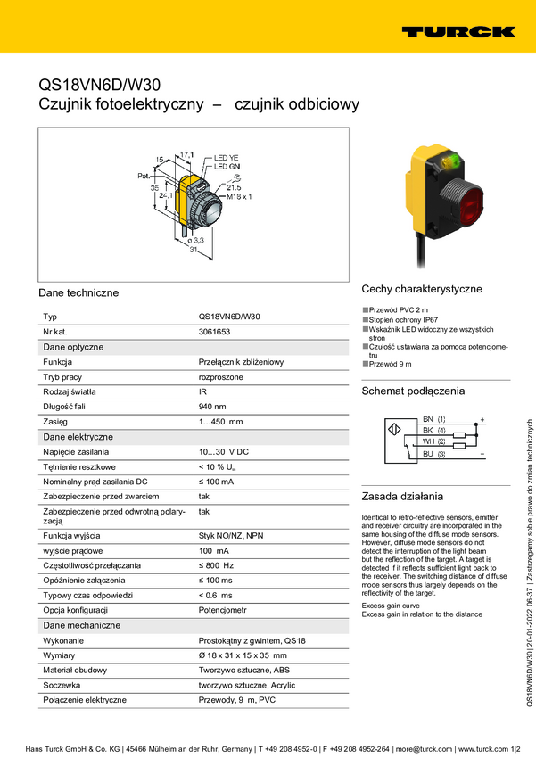 Czujnik dyfuzyjny Turck QS18VN6D/W30 3061653 1 szt.