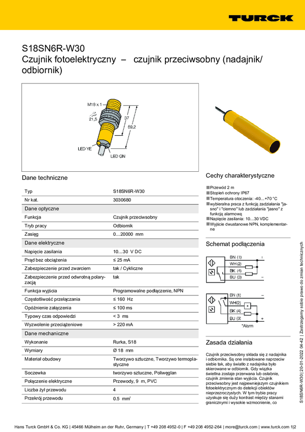 Bezzwrotny czujnik fotoelektryczny Turck S18SN6R-W30 3030680 1 szt.