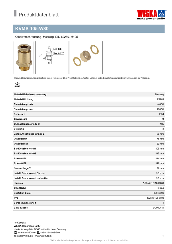 Wiska 10016896 Dławnica kablowa KVMS 105-W80, od 78 mm, do 83 mm, M105, 1 szt.