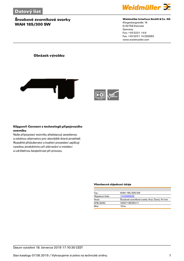 Pokrywa Weidmüller WAH 185/300 SW 1248980000, 10 szt.