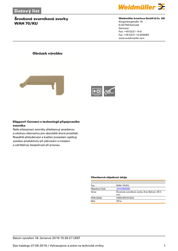 Pokrywa Weidmüller WAH 70/KU 1070360000, 20 szt.
