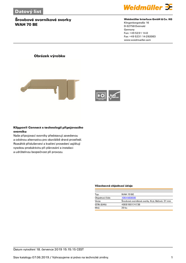 Pokrywa Weidmüller WAH 70 BE 1064560000, 20 szt.