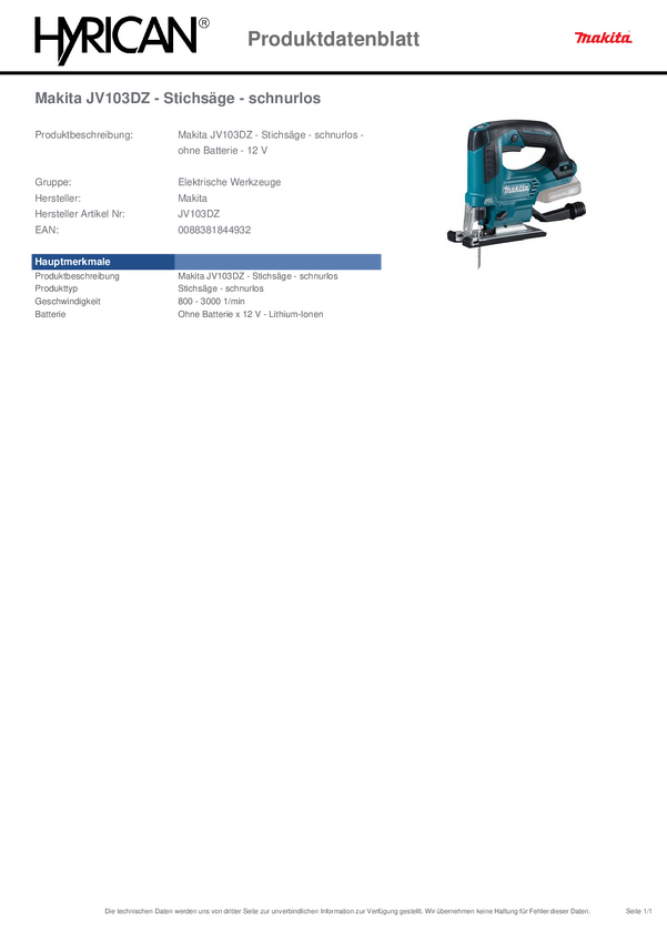 Makita Piła wahadłowa akumulatorowa JV103DZ bez akumulatora 10.8 V