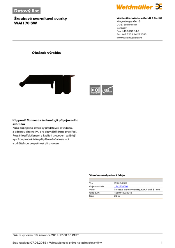 Pokrywa Weidmüller WAH 70 SW 1247330000, 20 szt.