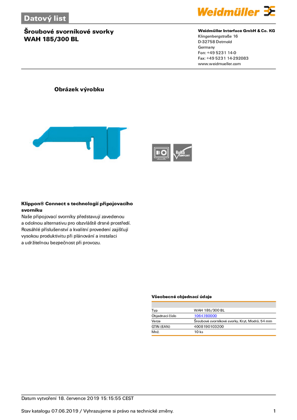 Pokrywa Weidmüller WAH 185/300 BL 1064780000, 10 szt.