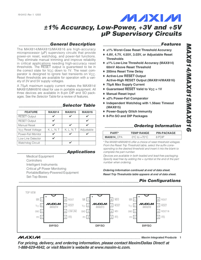 MAX816 High-Accuracy, 1%, Low-Power, 3V and 5V &#181P Supervisory Circuit with Power-Fail Warning and Adjustable Thresholds