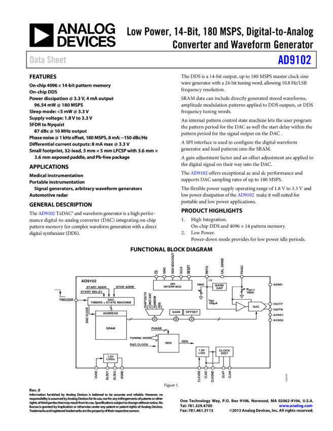 AD9102: Low Power, 14 Bit, 180MSPS, Digital to Analog Converter and Waveform Generator