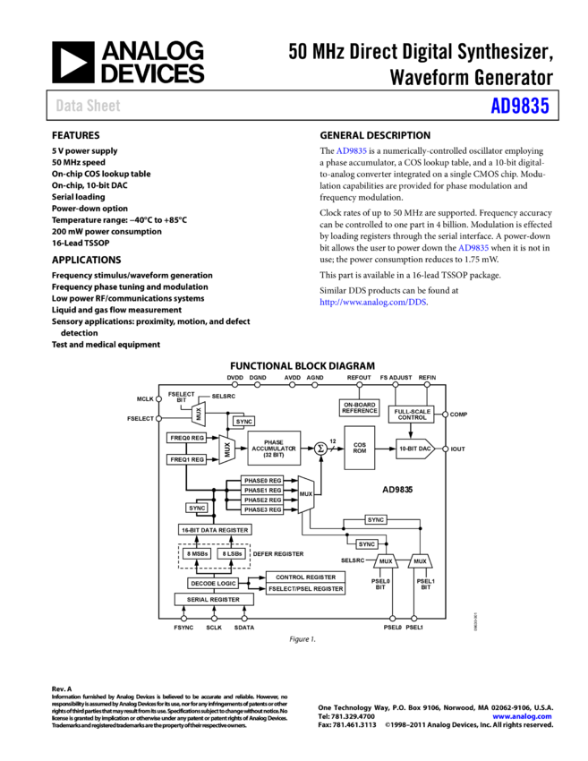 AD9835: 50 MHz Direct Digital Synthesizer, Waveform Generator